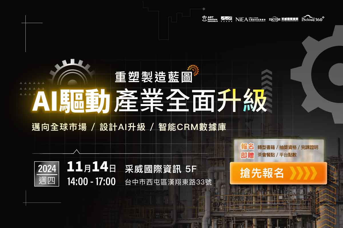 【IScloud360 平台會員限定】成功企業在產業中能夠持盈保泰 決勝秘訣都藏於產業工作坊 采威國際資訊 IScloud360 一站式雲端智慧服務平台,將於2024年度辦理十場產業工作坊 (價值$30,000 ),月月探索各產業數位與淨零雙軌轉型的實務策略應用,從策略方法面向切入關鍵重點,深入探索產業精彩實例個案,由企業領袖以及產業專家現身說法,綜合座談精彩交流,邀請您和我們一起從產業工作坊實務進攻,快速創造數位轉型新高峰。 凡為IScloud360平台會員,任君選擇 2 場產業工作坊免費參與權,即擁享 6,000元會員價值 (請點選前往登記) | 【工作坊聯絡】采威國際資訊 IScloud360雲端平台 |產業工作坊小組 聯絡電話:04-2326-5200 #235 施小姐